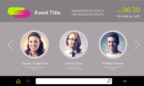 Система навигации — это интерактивная карта выставки или форума, интуитивное построение маршрутов и отображение программы мероприятий и спикеров. Всё под рукой! Кроме того, доступны горячие клавиши, уникальные идентификаторы, онлайн-обновление карт, рекламные возможности, а также возможность отображения экстренных или информационных сообщений. Ваш новый опыт навигации на мероприятии.